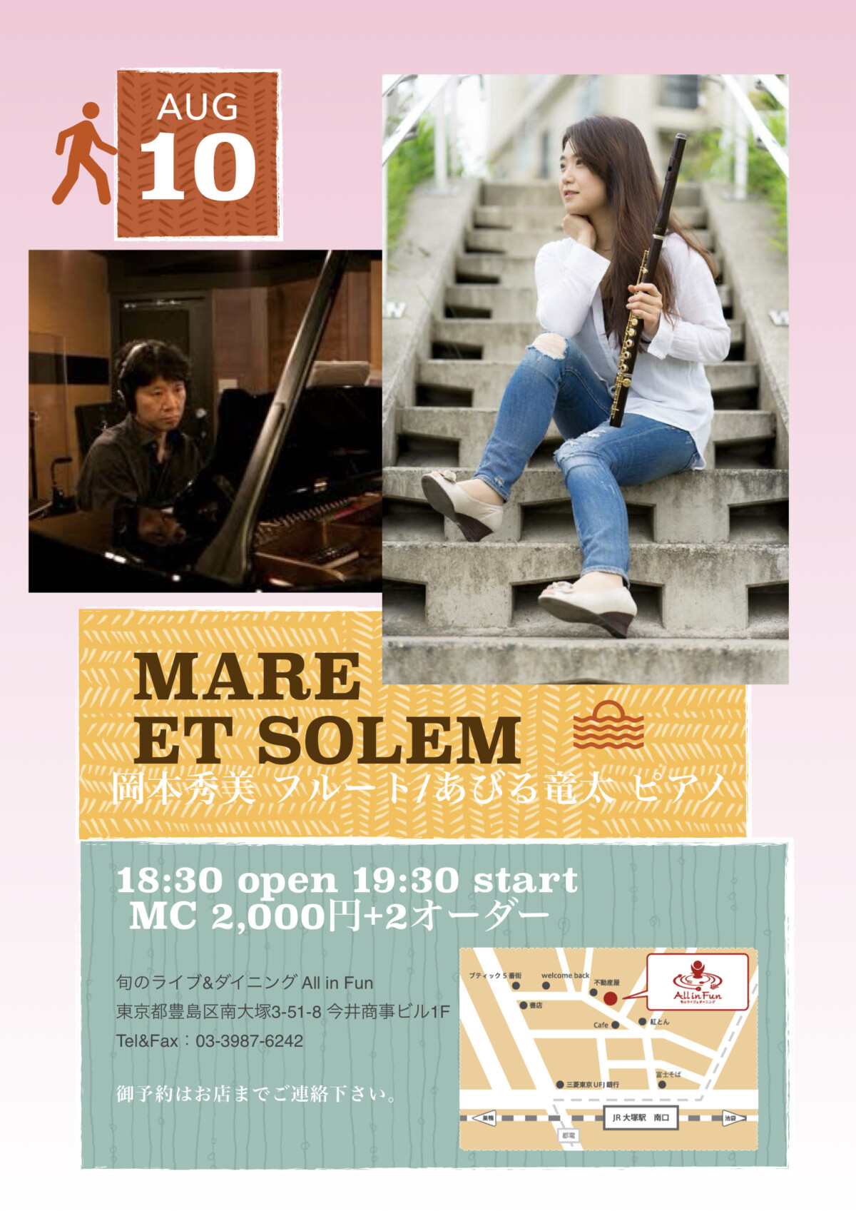 ライブ情報 10Aug2018 2018年8月10日 MARE ET SOLEM 2018年8月10日 MARE ET SOLEM コンサート詳細 18:30 開場 19:30 開演 会場:旬のライブ&ダイニング ALL in Fun チケット: 2,000円 出演: フルート 岡本 秀美 ピアノ あびる竜太 ライブ情報 2018年9月26日 RITMO!! 関連記事一覧 2023年9月30日 秋色コンサート 2023年9月22日 inDuo 2026年4月18日(土)【Re:Start】 2022年6月27日 HIDEMI OKAMOTO LIVE 2020年2月2日 HIDEMI OKAMOTO BIRTHDAY LIVE 2020年9月13日 HIDEMI OKAMOTO FLUTE LIVE