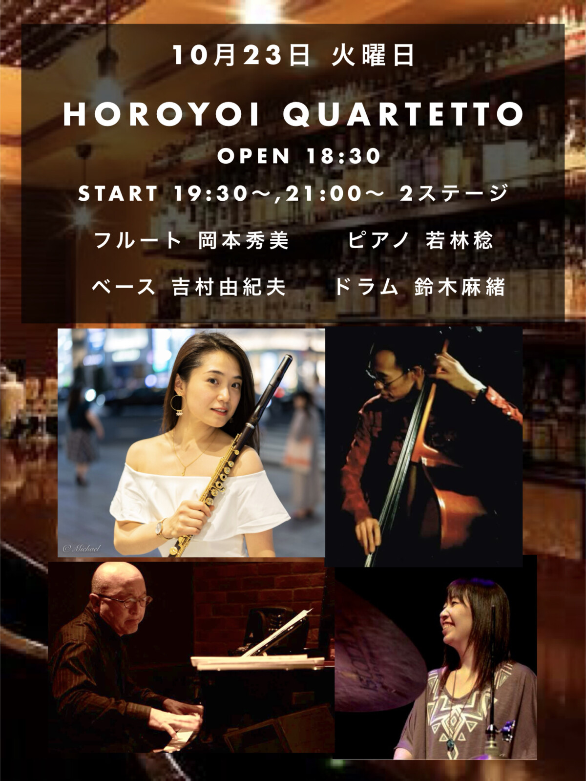 ライブ情報 23Oct2019 2019年10月23日 HOROYOI QUARTETTO 2019年10月23日 HOROYOI QUARTETTO コンサート詳細 18:30 開場 19:30 / 21:00 開演(2ステージ) 出演: フルート 岡本 秀美 ピアノ 若林 稔 ベース 吉村 由紀夫 ドラム 鈴木 麻緒 ライブ情報 2019年6月16日 RITMU MAX 2020年2月2日 HIDEMI OKAMOTO BIRTHDAY LIVE 関連記事一覧 2020年7月12日 HIDEMI OKAMOTO 2020年9月13日 HIDEMI OKAMOTO FLUTE LIVE 2020年12月20日 X’mas Flute Live 2018年8月10日 MARE ET SOLEM 2019年2月12日 WINTER SONGS 2022年6月27日 HIDEMI OKAMOTO LIVE